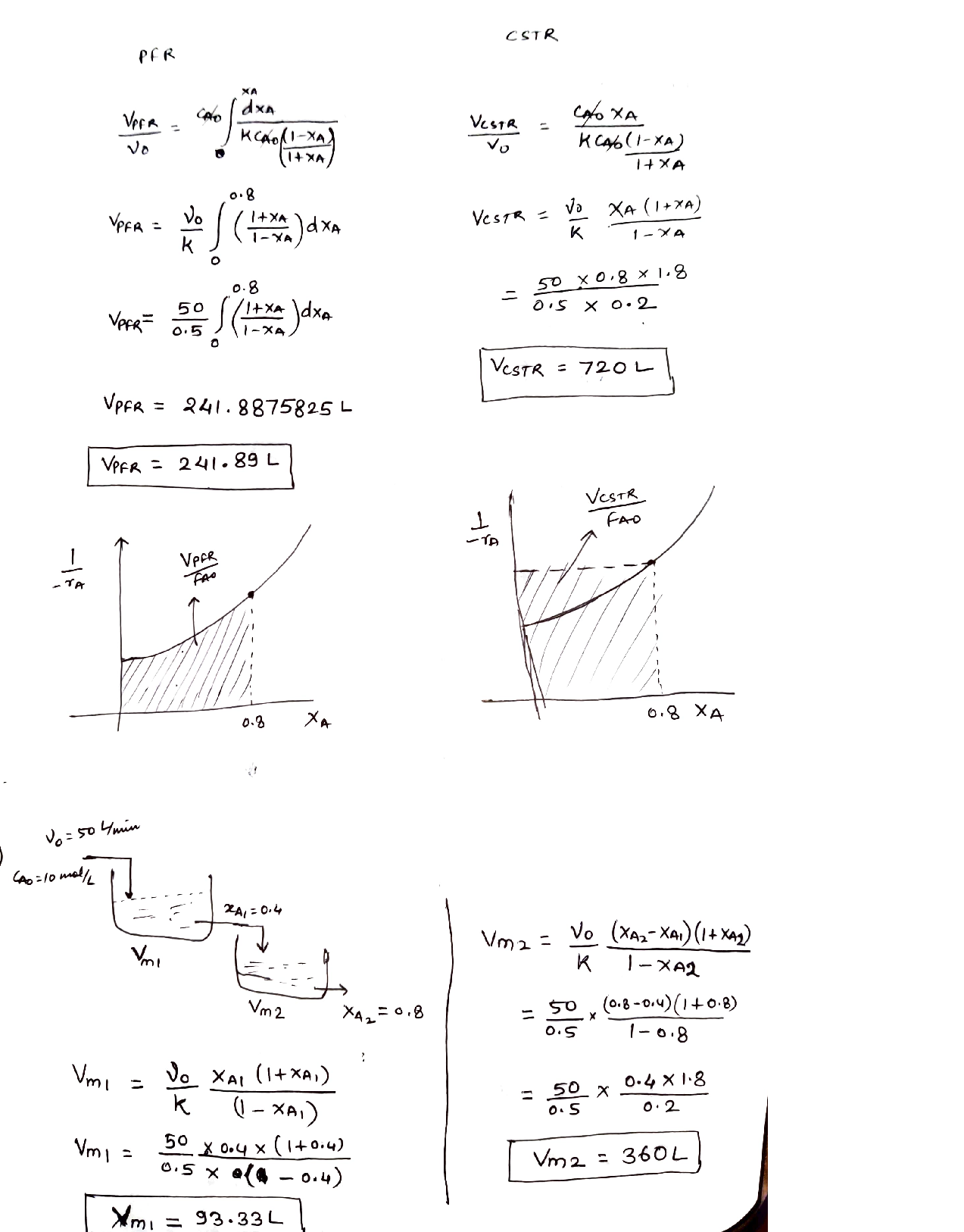 Provide a comparison and evaluation of the volumes of a PFR reactor (VPFR)and a CSTR reactor (VCSTR) for the reaction.