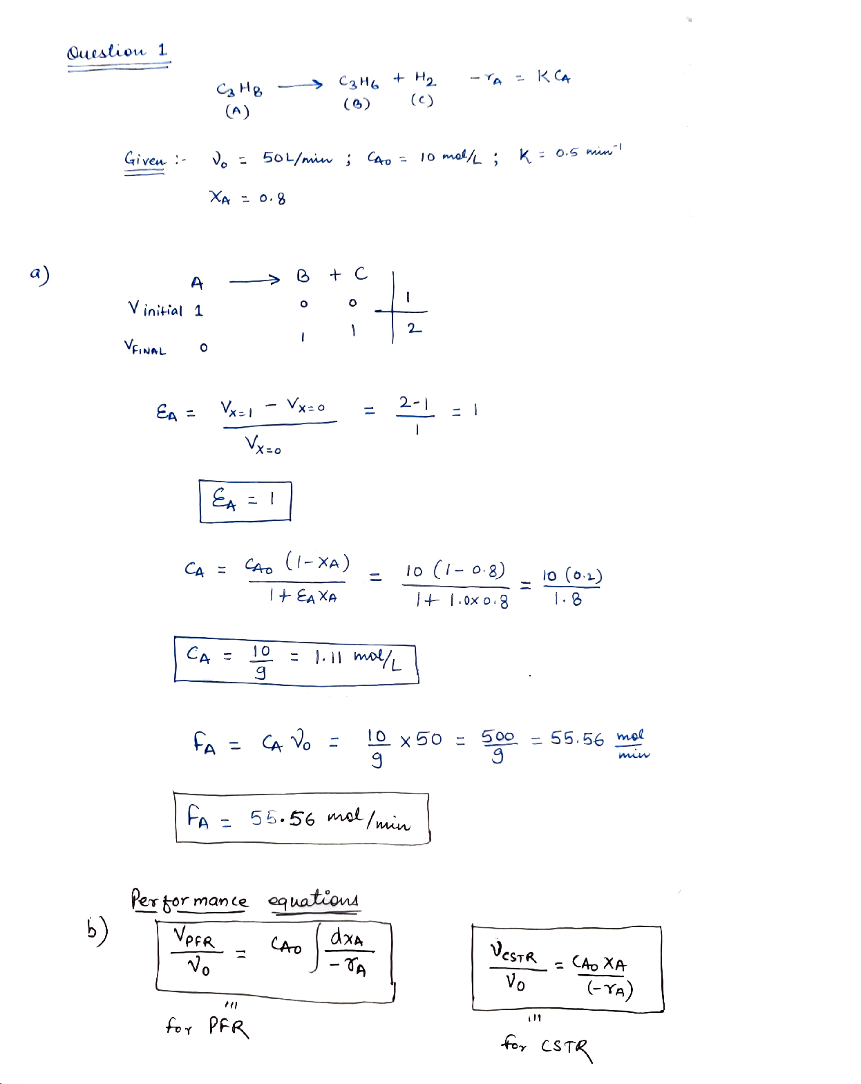 O Calculate the fractional volume change of A (EA), the final concentration of A(CA) and final molar flow rate (mol/min) of A (FA) at the exit of the reactor.
