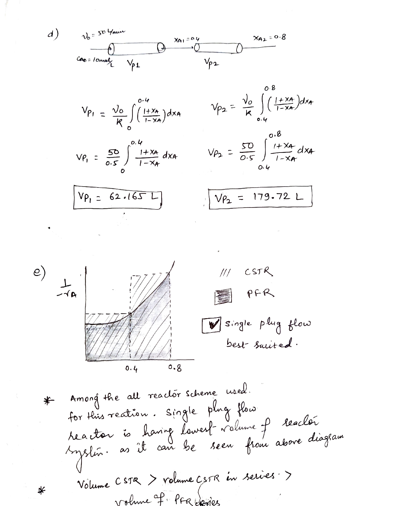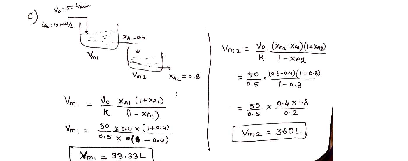 If the reaction is carried out in two PFR in series under the same conditions as the above item c, estimate the volumes of two PFR.[10%]